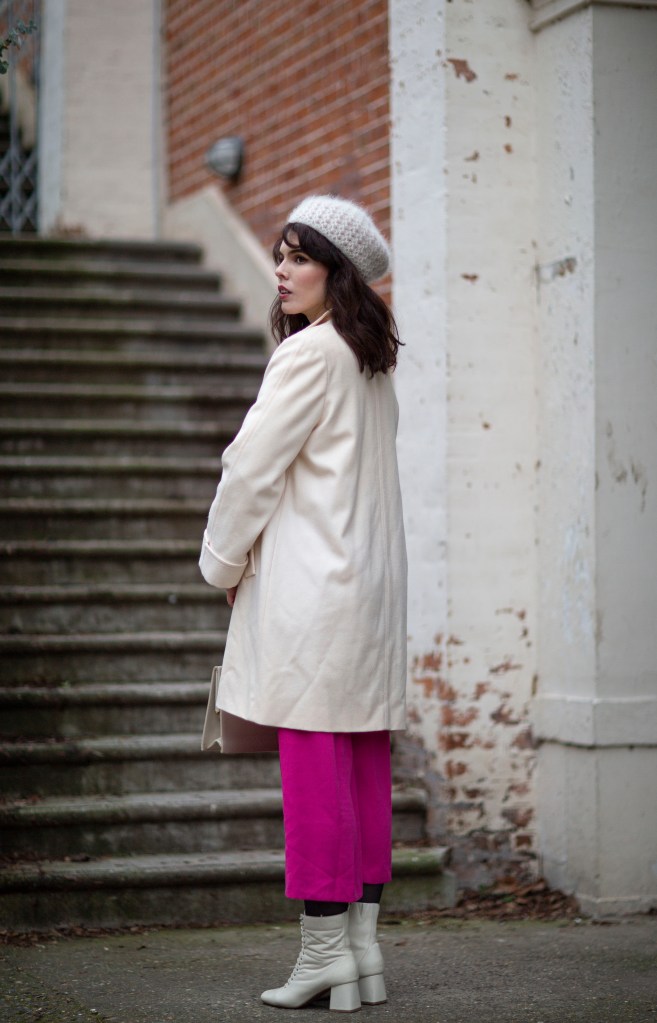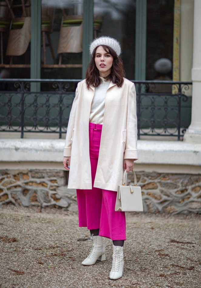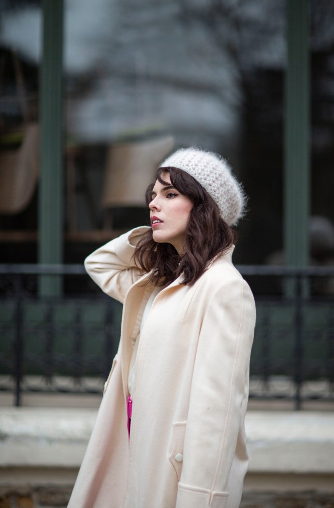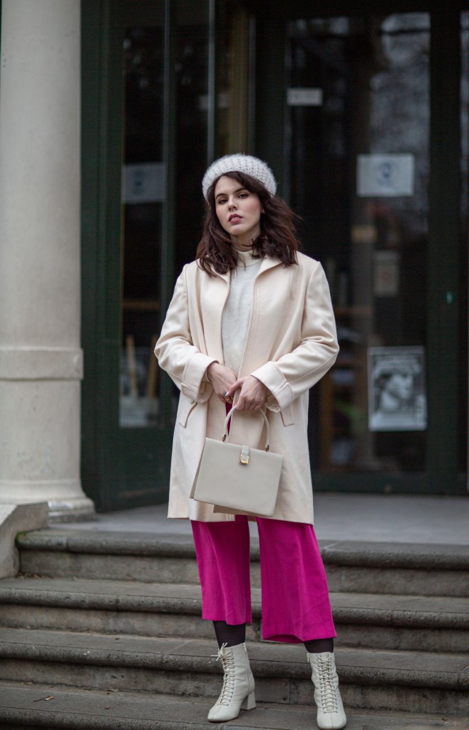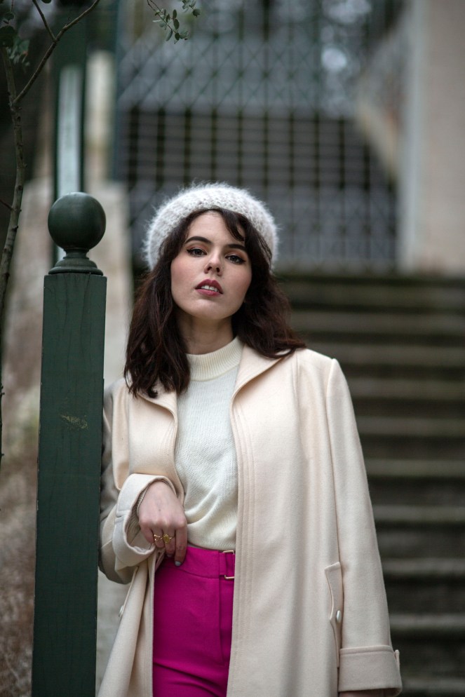 Je porte un béret en maille vintage (trouvé à boutique de seconde-main Merci Madame, au Cannet), un pull blanc vintage trouvé en vide-grenier, un manteau vintage trouvé en vide-grenier, un vieux pantalon rose (relique de mes années fast-fashion), un sac vintage trouvé chez Emmaüs, et des bottines blanches lacées.
