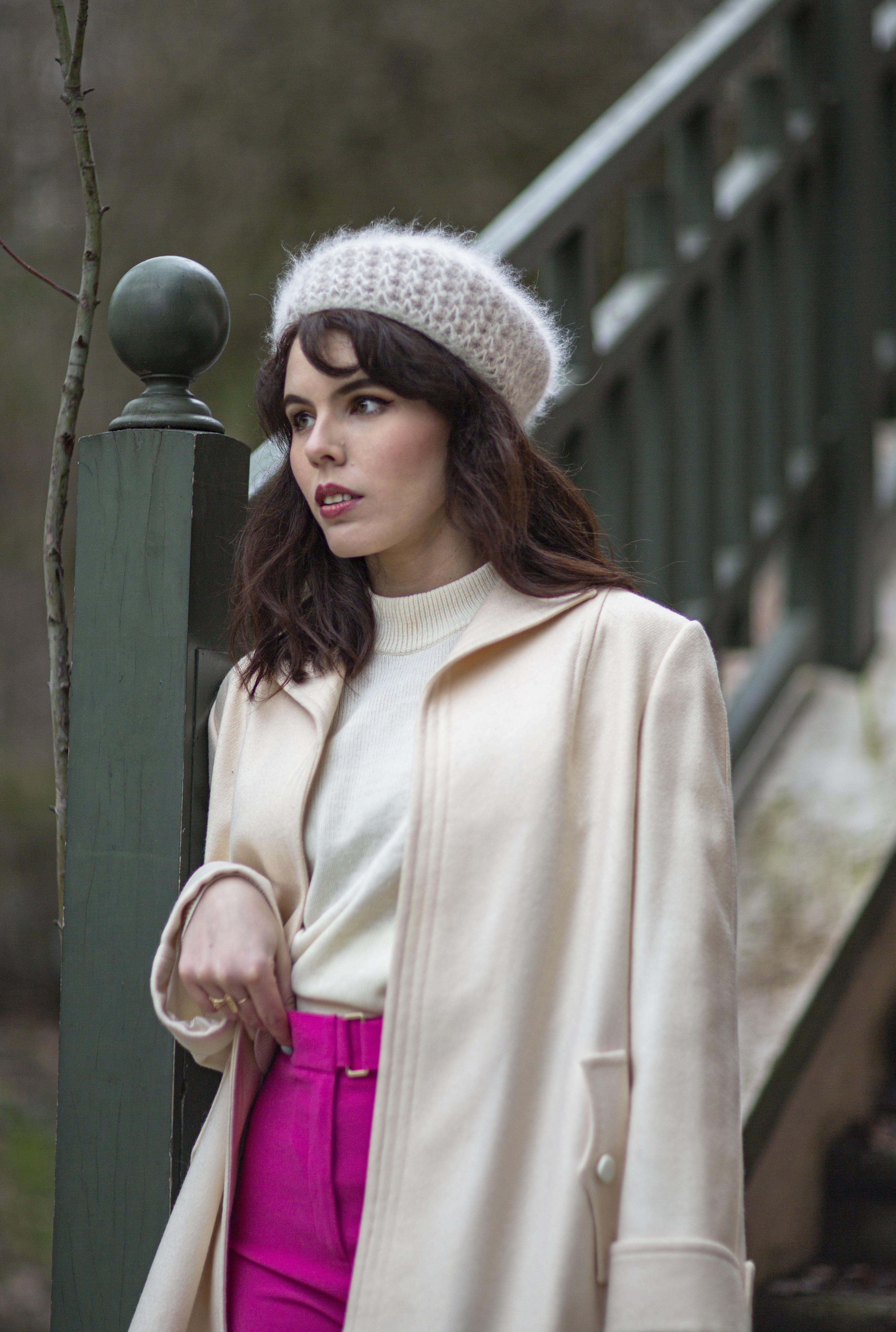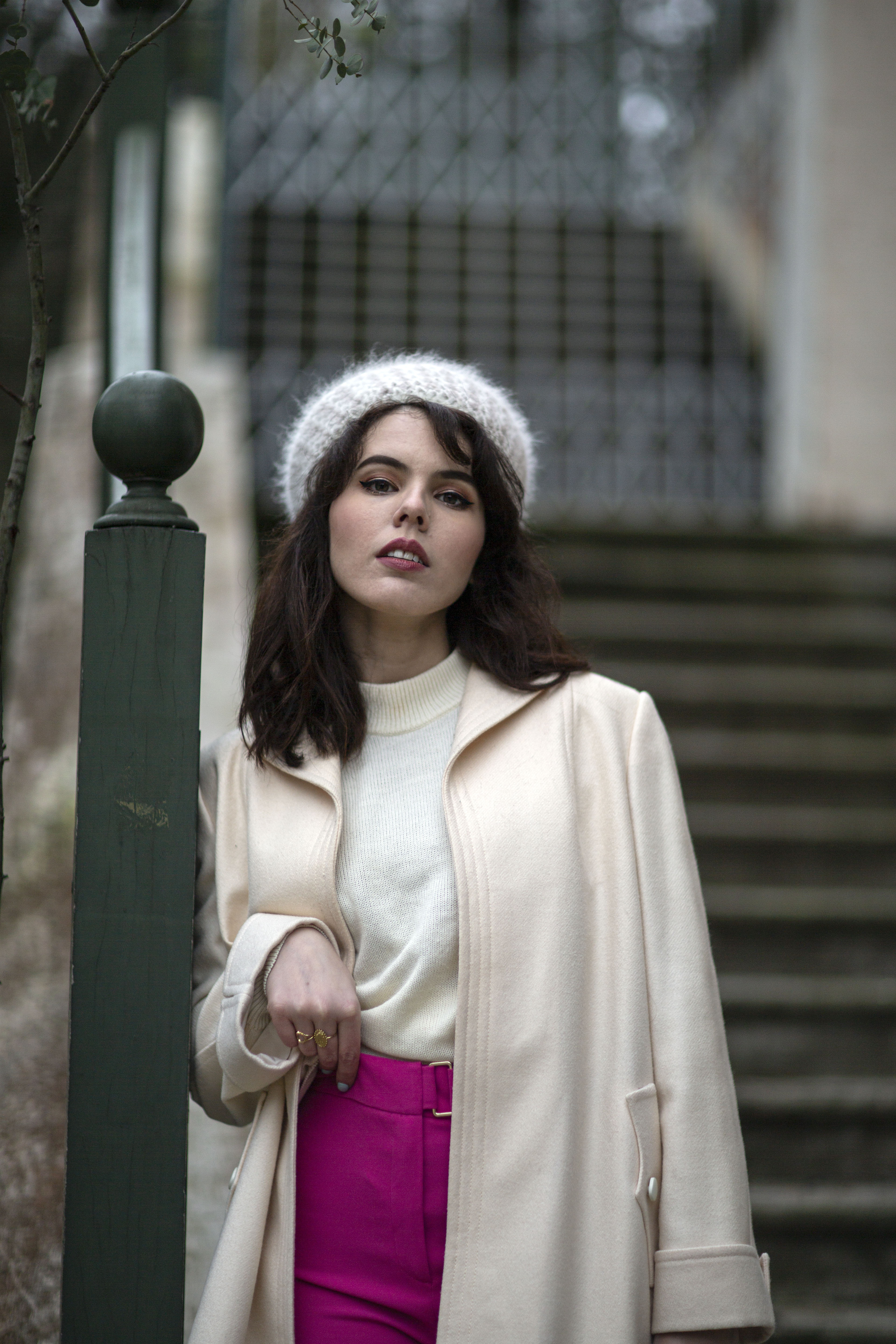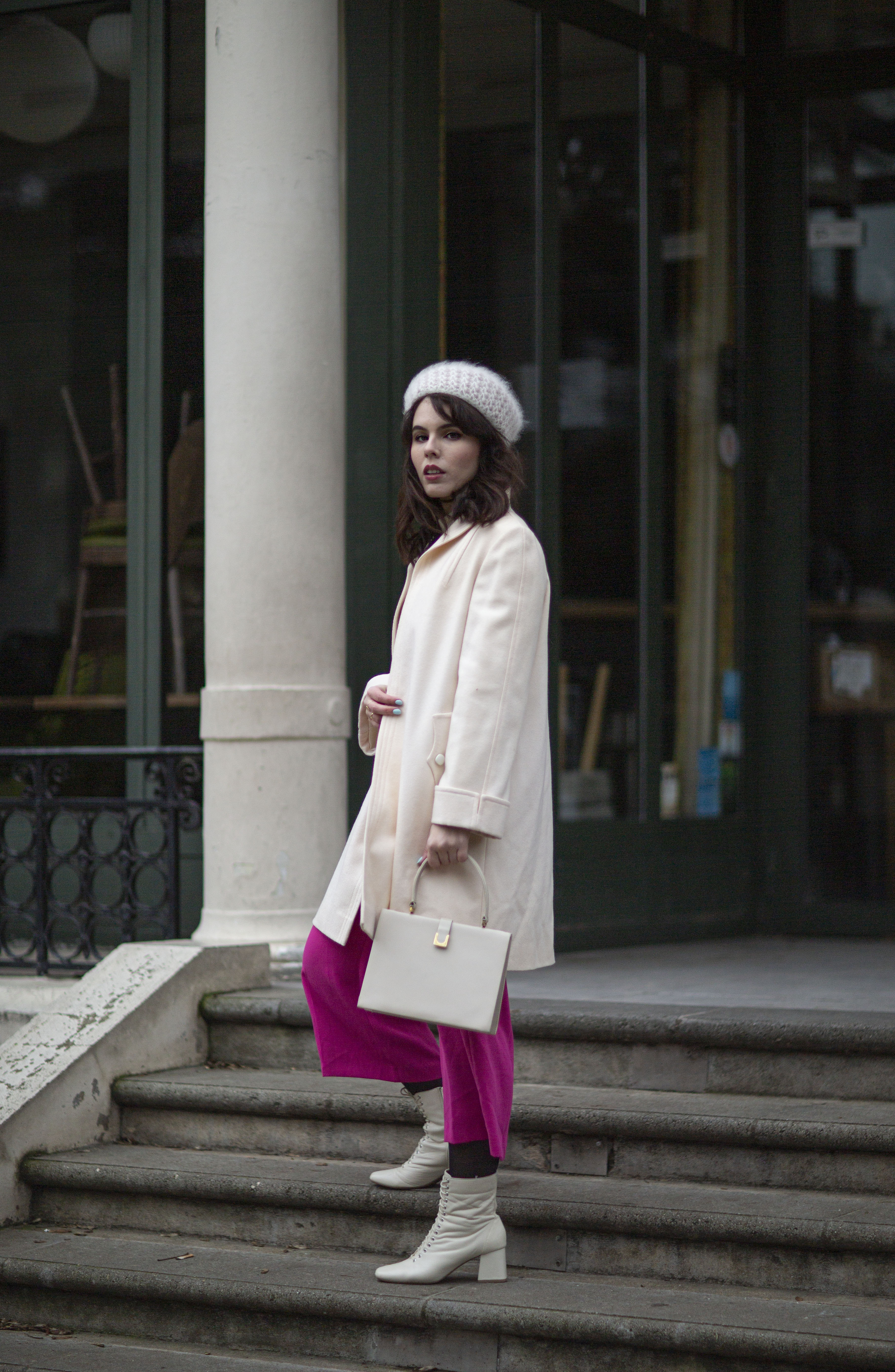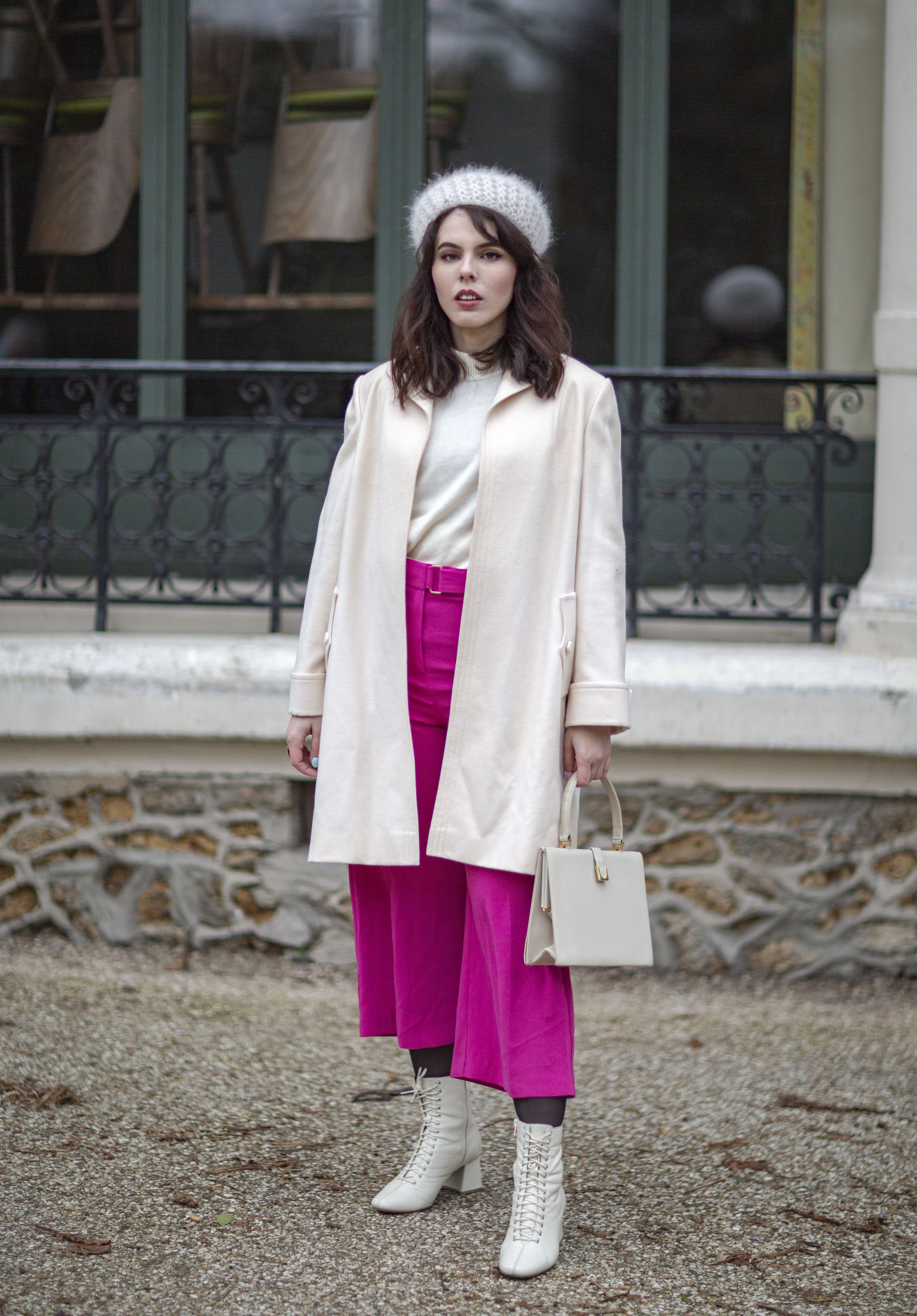 Je porte un béret en maille vintage (trouvé à boutique de seconde-main Merci Madame, au Cannet), un pull blanc vintage trouvé en vide-grenier, un manteau vintage trouvé en vide-grenier, un vieux pantalon rose (relique de mes années fast-fashion), un sac vintage trouvé chez Emmaüs, et des bottines blanches lacées.